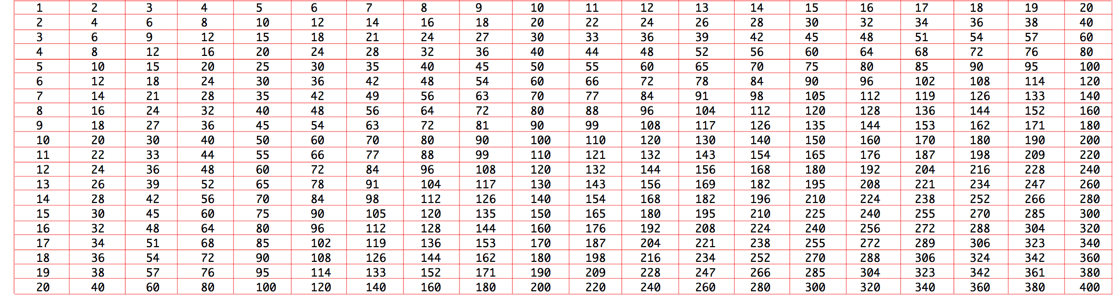 Write efficient code to create a two-dimensional array containing the 20 rows and 20 columns of a multiplication table from 1 to 20.