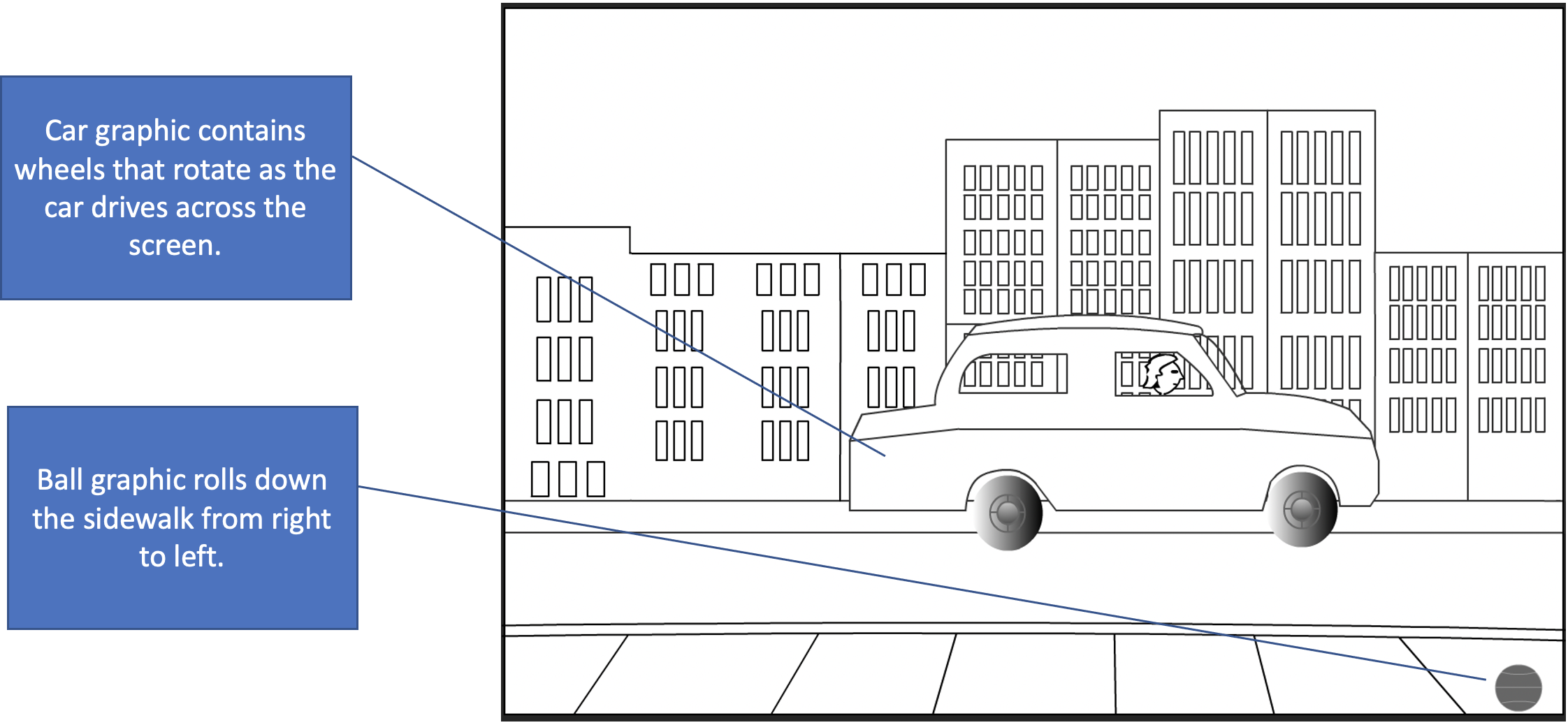 The image below represents a snapshot of programmed movement containing a car and a basketball.