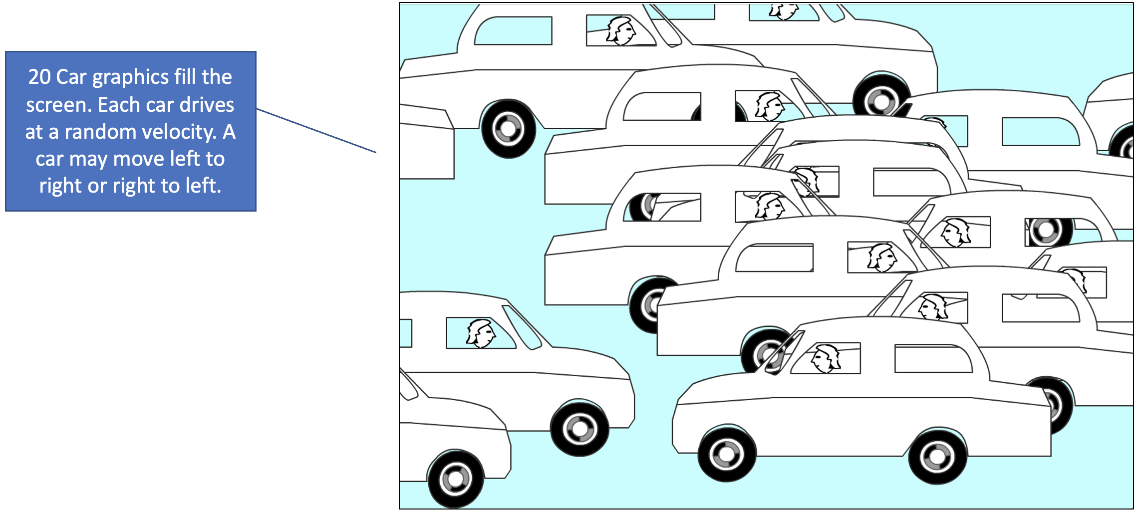 - Once a car object drives off the screen, it must be repositioned so that it can start again with a different velocity.