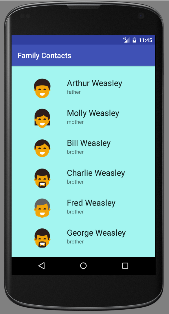 Task 2: Build a custom Contact layout: contact_item.xml ![]() Task 3: Build the Contact.java class, to model each contact object. Task 4: Modify the MainActivity.xml layout. Task 5: Complete the MainActivity.java class. Make modifications to optimize memory by using an ArrayAdapter. |
