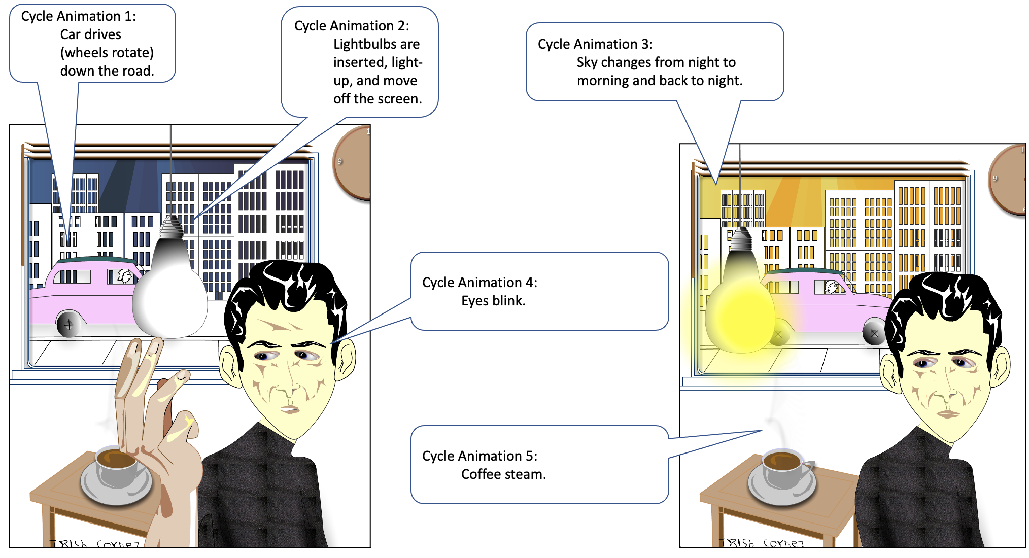 a looping animation of elements, such as the blinking of an eye. There is no beginning, middle, or