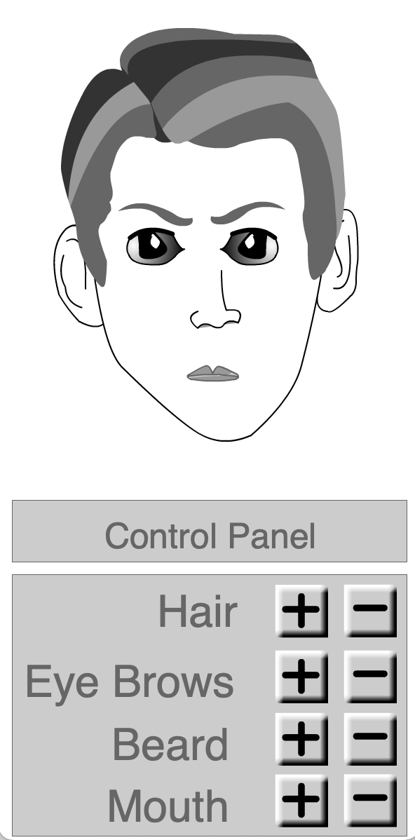 Construct the App shown in this image. A character has a collection of facial attributes that a user can alter by clicking buttons. |