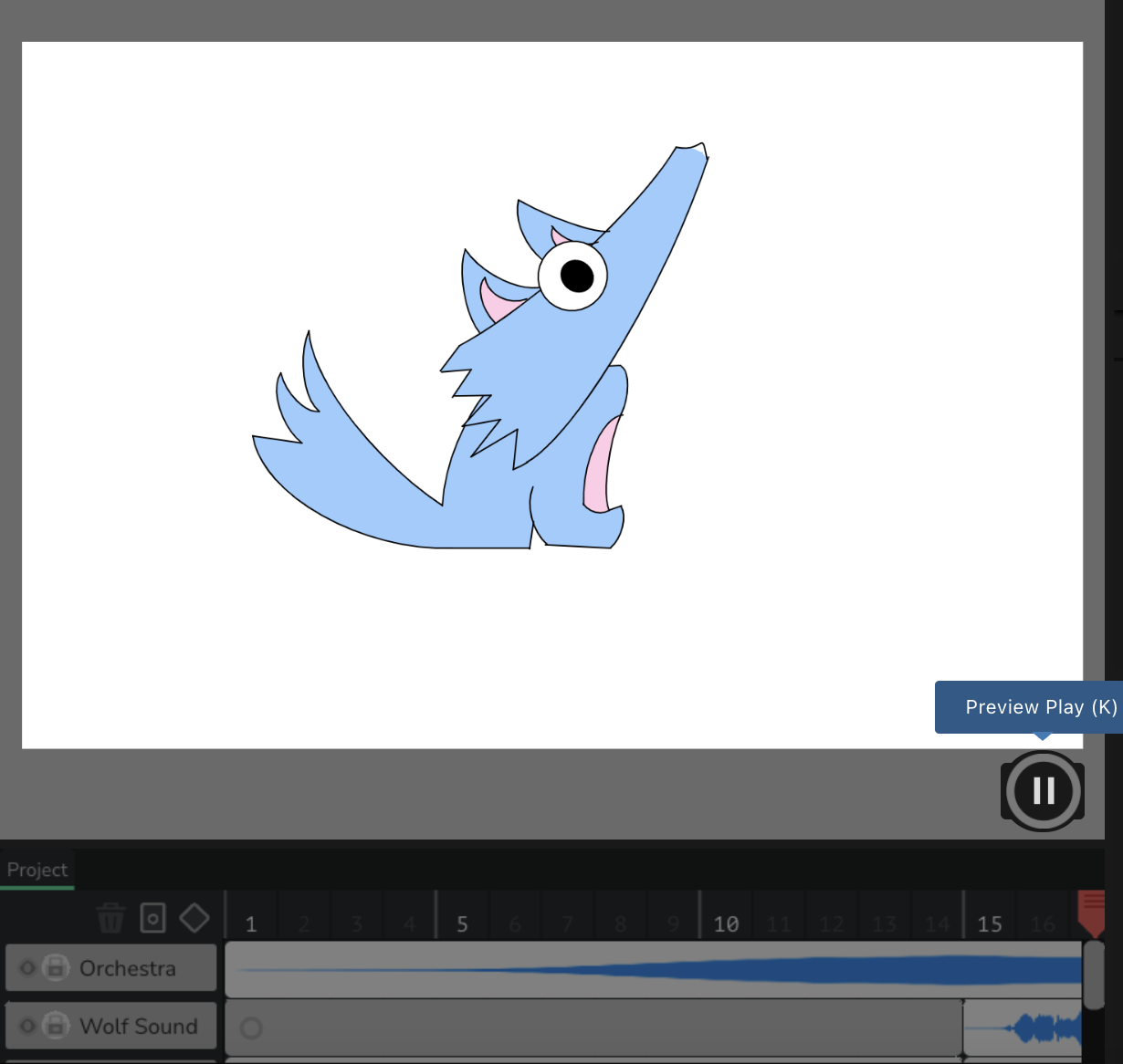 Create a Wick Editor project featuring a baby wolf howling. Add an ominous orchestra sound as a backdrop to the howling sounds. |
