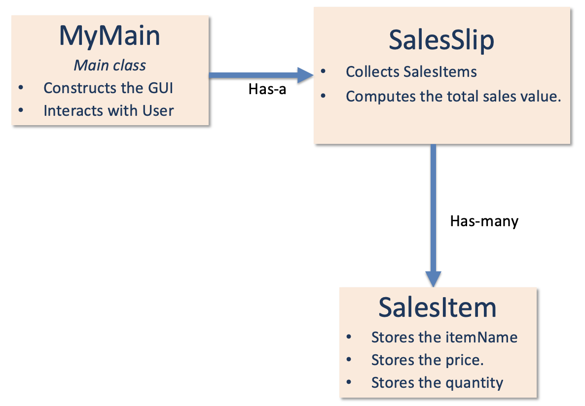 Classes needed: MyMain.java, SalesSlip.java, and SalesItem.java.